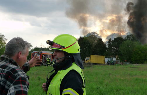Der Eigentümer kann sich das Feuer nicht erklären. Hier im Gespräch mit der Feuerwehr.