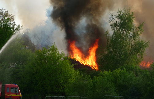 Wasserwerfer auf den Fahrzeugen und Strahlrohre am Boden versuchen das Feuer einzudämmen. Mittlerweile brennen sogar angrenzende Bäume. Schnell wird klar: das Hofgebäude ist nicht zu retten. Das Dach und auch Mauern stürzen ein.