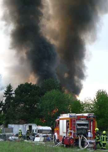 Das Feuer breitete sich rasend schnell aus, große Gefahr für die Retter bestand in einer Vielzahl von Gasflaschen auf dem Gelände, deren Inhalt wahrscheinlich Acetylen ist. Es besteht Explosionsgefahr! Eine große schwarze Rauchwolke steht über dem Stadtteil, weithin sichtbar.