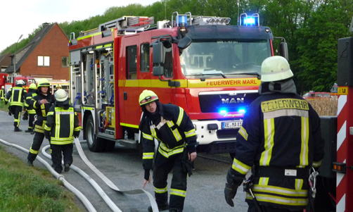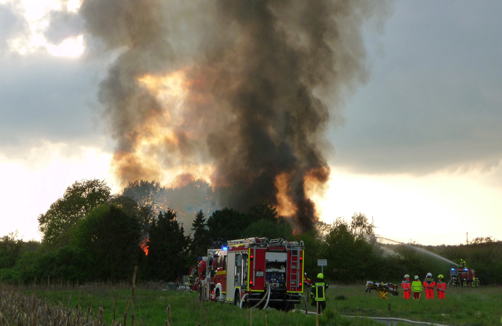 Immer mehr Feuerwehrfahrzeuge treffen ein. Die Kräfte müssen mehrere hundert Meter lange Wasserschläuche legen um für Nachschub zu sorgen. Die mit Wasser gefüllten Löschfahrzeuge haben ihren Inhalt schnell verspritzt.