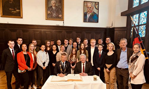 Das Programm rund um den Vortrag des Bundespräsidenten a.D. wurde von sieben weiterführenden Schulen gestaltet – die Beiträge drehten sich um die Themen Demokratie und Menschenrechte. Elsie Lukoki, Noelle Nachlik und Vivian Zimmer vom Alexandrine-Hegemann-Berufskolleg stellten ihr Projekt zur Flüchtlingsintegration vor, während Berfin Dönmez und Jana Prigodin von der Käthe-Kollwitz-Gesamtschule einen Poetry-Slam-Vortrag vorbereitet hatten. Jasmin Gurofski und Emily Jost von der Dietrich-Bonhoeffer-Realschule präsentierten ihre Ausstellung zum Thema „Revolution und Frühphase der Weimarer Republik“ und Ben Hilker (Otto-Burrmeister-Realschule/KiJuPa) berichteten von seinen Erfahrungen beim Besuch des Konzentrationslagers Auschwitz und der Gedenkstätte Yad Vashem. Die Big Band des Hittorf-Gymnasiums und Mitglieder des Petrinum-Orchesters umrahmten die Veranstaltung musikalisch. Schüler des Theoder-Heuss-Gymnasiums luden die Gäste dazu ein, ihre Wünsche und Hoffnungen für Europa auf Sterne zu schreiben, die sie dann dem Bundespräsidenten a.D. schenkten.