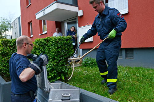 Maria Brüggendick zeigte sich nach der gelungen Einfangaktion erleichtert: „Ich bin froh, dass alles so gut geklappt hat. Ich hatte mich richtig erschreckt, als ich das Tier hier entdeckt habe. So etwas sieht man ja nicht jeden Tag.“ Die Feuerwehr nahm die Schlange mit zur Wache, wo sie zunächst versorgt wurde. Sie soll einer fachkundigen Person übergeben werden. Die Polizei erschien ebenfalls vor Ort und nahm die Ermittlungen auf, wie und warum das Reptil frei herum lief. Foto: Bludau