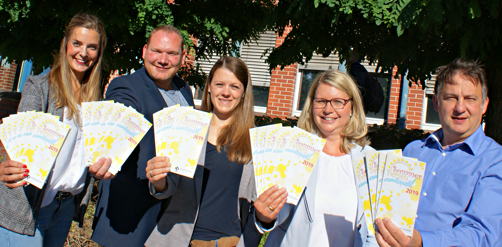 Das Bild zeigt (v.l.) Eden Fähnrich, David Rikels, Silke Alfes von der Abteilung Jungedförderung im Jugendamt, Erste Beigeordnete Nina Laubenthal und Jugendamtsleiter Stefan Breuer mit der Broschüre zum Ferienspaß 2019. Foto: Stadt Dorsten