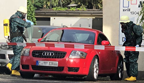 Bild: Spezialkräfte der Feuerwehr inspizieren das stinkende Fahrzeug. Foto: Bludau