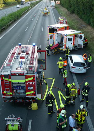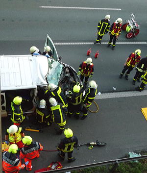 Der 22-jähriger Fahrer des Kleintransporters war auf der A 2 bei Recklinghausen-Suderwich seitlich in einen Sattelzug geprallt und mit seinem Wagen über die Fahrbahn geschleudert. Seine beiden Mitfahrer wurden dabei schwer verletzt, der Fahrer selbst blieb unverletzt. Nach Eintreffen der Feuerwehr setzte eine aufwändige Rettungsmaßnahme ein um die Verletzten aus dem zerstörten Transporter zu befreien.
