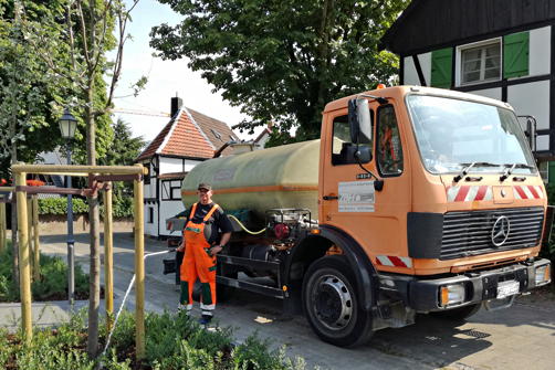 Mehrmals pro Tag fährt der Wasserwagen des ZBHs durch Herten, um die Pflanzen mit dem benötigten Wasser zu versorgen. Pro Fahrt können 6.000 Liter Wasser transportiert und verteilt werden. „Obwohl der Wagen zweimal täglich aufgefüllt wird, ist dies bei der Hitze nur ein Tropfen auf den heißen Stein“, so Lars Kuhnt, Baumsachverständiger des ZBH.