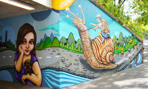 „Gehen – stehen – rennen“ – unter diesem Motto hatte die Stadt Marl im Juni zu einer Graffiti-Aktion aufgerufen. Acht Künstlerinnen und Künstler aus dem Ruhrgebiet wurden eingeladen, die Wände des Y-Tunnels freundlicher zu gestalten und die Vorzüge des Zufußgehens auf spielerische und humorvolle Art darzustellen. Seit Mitte August haben die Sprayer an der Gestaltung des Tunnels gearbeitet und viel positives Feedback von Passanten für ihre ideenreichen Graffiti bekommen.