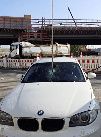 Der Fahrer des Wagens, ein 27-Jähriger aus Haltern am See musste am Montagmorgen unter der Autobahnbrücke der A43 auf der Friedrich-Ebert-Straße halten. Oben auf der Brücke wurde auf der Autobahnbaustelle gearbeitet. Durch einen Spalt zwischen den Fahrbahnen fiel eine drei Meter lange Eisenstange von der Brücke herunter und bohrte sich durch die Windschutzscheibe bis ins Armaturenbrett. Der Fahrer und seine 63-jährige Beifahrerin aus Herten kamen mit dem Schrecken davon. Die Polizei geht von einem Unfall aus.Foto: Polizei
