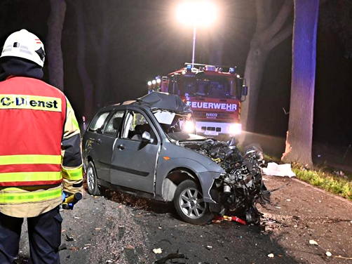 Durch die Wucht des Aufpralls wurden unter anderem Teile des Motorblocks aus dem Pkw gerissen, eine Dachreling bohrte sich wie ein Pfeil in eine massive Eiche. Den Einsatzkräften bot sich ein Trümmerfeld über mehrere Meter.