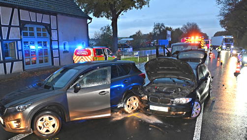 Die Fahrzeuginsassen der betroffenen Fahrzeuge kamen nach der Behandlung durch einen Notarzt zur weiteren Versorgung in Krankenhäuser. Als Folge des Unfalls war eine Fahrspur komplett gesperrt. Der Verkehr konnte nur abwechselnd die Unfallstelle passieren. Es kam zu erheblichem Rückstau im Berufsverkehr. Foto: Bludau
