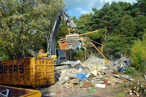 Das Vereinshaus am Gerhard-Jüttner-Stadion ist Vergangenheit: Eine Fachfirma hat das Gebäude im Auftrag der Stadt Marl abgerissen und die Überreste entsorgt. Der Abbruch wurde möglich, nachdem die erforderlichen Haushaltsmittel freigegeben wurden und das Gebäude während der Erweiterung der benachbarten Kita Lummerland nicht länger für die Lagerung von Außenspielgeräten zur Verfügung stehen musste. Auf dem Gelände des ehemaligen Stadions, das zugunsten der neuen Sportanlage Triple X im Stadtzentrum aufgegeben wurde, soll ein Baseball-Stadion entstehen, mit dem die Slydogs eine neue Heimat erhalten. Der Baseballverein nutzt derzeit das Jahnstadion, auf dessen Gelände ein neues Wohnquartier geplant ist. Foto: Stadt Marl / Pressestelle