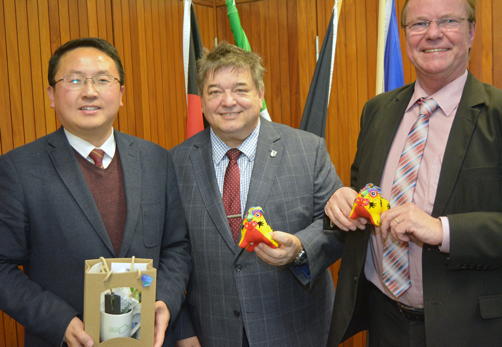 Bild: Chinesischer Besuch im Rathaus: Bürgermeister Werner Arndt (Mitte) tauschte sich jetzt gemeinsam mit Wirtschaftsförderer Dr. Manfred Gehrke (rechts) und Li Jie über die Herausforderungen in beiden Städten aus. Foto: Stadt Marl