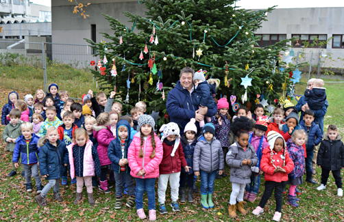Bild: Gemeinsam mit Bürgermeister Werner Arndt haben zahlreiche Kinder den Weihnachtsbaum vor dem Rathaus mit selbstgebastelten Sternen, Kerzen und Tannenzweigen geschmückt.