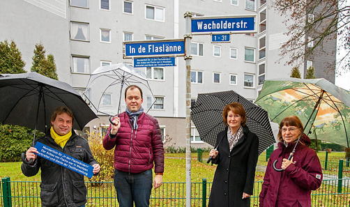 Im Rahmen des Projekts „Marler Straßengeschichten“ wird über die Bedeutung des Straßennamens in Sinsen informiert: In de Flaslänne. Die Stadt hatte im Oktober 1950 den Namen vergeben. Als Alternativen standen die Namen „Flachsweg“ und „Am Flachsland“ zur Diskussion, doch der Rat entschied sich für die mundartliche Abwandlung. Flachs, eigentlich „Gemeiner Lein“, ist eine Kulturpflanze, die hierzulande vor allem für die Textilproduktion angebaut und genutzt wurde. Vom Mittelalter bis zur Frühen Neuzeit wurde Flachs besonders in Westfalen auf Feldern angebaut und meist auf nahen Bauernhöfen direkt verarbeitet.