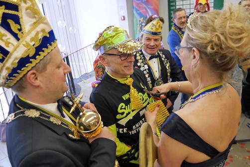Herten. Pünktlich um 15.11 Uhr hat Prinzessin Sandra I. an Weiberfastnacht mit ihrem Gefolge das Hertener Rathaus erobert und Bürgermeister Fred Toplak den Rathausschlüssel abgenommen. Traditionell trafen sich die Närrinnen und Narren der Karnevalsgesellschaft Herten-Langenbochum zur Machtübernahme im und vor dem Bürgermeisterbüro. Seine Krawatte büßte das Stadtoberhaupt dann auch direkt ein. Gekonnt schnitt Prinzessin Sandra I. das gute Stück mit der Schere ab. Zuvor hatte sie den Bürgermeister schon gefesselte und riss den Rathausschlüssel an sich: „Jetzt habe ich hier das Sagen.“