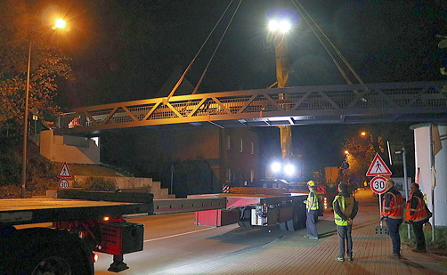 Oer-Erkenschwick. In einer Nacht-Aktion wurde eine neue Brücke für Radfahrer und Fußgänger über die Recklinghäuser Straße in Oer-Erkenschwick gehoben. Sie ist der Ersatz für eine marode Holzbrücke, die bereits 2017 abgerissen wurde.