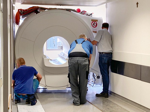 Hoher technischer und logistischer Aufwand sind mit einem neuen MRT verbunden. Schon vier Wochen vorher haben die Arbeiten begonnen. Die alte Kabine wurde komplett leer gemacht, der alte Magnet wurde abtransportiert, der Untersuchungsraum renoviert und mit Kupfer ausgekleidet, um das Magnetfeld abzuschirmen. Dr. Thomas Schmitka, Chefarzt der Radiologie, hat dem neuen Gerät schon entgegengefiebert: „Das ist leitungsstärker und schneller, so werden die Bilder besser und die Zeit in der engen Röhre für die Patienten kürzer. Wir freuen uns, auf die neuen Möglichkeiten.“