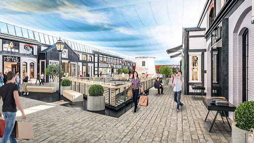 Bild: Die Visualisierung macht das spätere Aussehen des „Fashion Outlet Marl“ deutlich, als „Indoor Village Style“ bezeichnet.