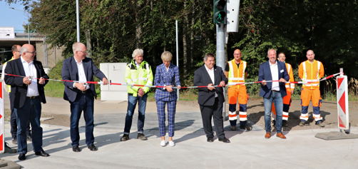 Bild: Gemeinsam mit den Planern und dem Bau-Team gaben Landrat Cay Süberkrüb (3. v. l.), Regierungspräsidentin Dorothee Feller (5. v. l.), Marls Bürgermeister Werner Arndt (5. v. r.) und Carsten Uhlenbrock (3. v. r.), Fachdienstleiter Tiefbau bei der Kreisverwaltung Recklinghausen, die neu ausgebaute K6 sowie die Anschlussstelle zur A52 wieder für den Verkehr frei.