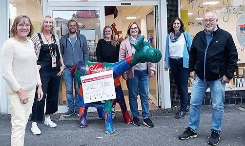 Bild: Spendenübergabe vor dem Ladenlokal von WiLLmA (v.l.): Marina Gesser, Andrea Selzer, Jonas Elsner, Johanna Krötz, Anke Eich, Sabine Austen-Jandewerth, Karl-Heinz Dargel