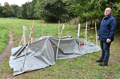Bild: Pferdebesitzer Peter Büning Bild) und seine Familie sind geschockt von dem schrecklichen Vorfall am Samstag. Da die tote Stute so schnell nicht abtransportiert werden konnte, wurde sie auf der Weide mit einer Plane abgedeckt. Die Besitzer hoffen nun auf Hinweise auf den oder die Täter. Peter Büning hat bisher eine Belohnung von 1.000 Euro ausgesetzt. Foto: Bludau
