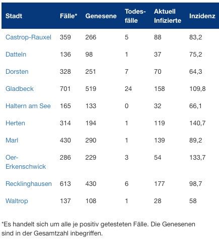 Aktuell gibt es 3469 bestätigte Corona-Fälle im Kreis Recklinghausen - 2518 Genesene - 49 TodesÂfälle - 902 Aktuell Infizierte - Inzidenz 93,5 (Stand 21.10.2020, 10 Uhr)