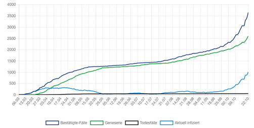 Vest. Der Kreis Recklinghausen meldet heute 3655 bestätigte Corona-Fälle im Kreis, davon sind 2598 genesen. Es gibt unverändert 49 TodesÂfälle. Aktuell gibt es 1008 Infizierte, der Inzidenzwert steigt auf 110,4 (Stand 22.10.2020, 10.30 Uhr). Die Grafik zeigt die Entwicklung der Covid19-Infektionen im Kreis Recklinghausen seit März 2020.
