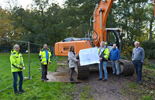 Bild: Die Sanierung der Teichanlage im Gänsebrink-Park in Hüls hat begonnen. Mit dabei waren: Brigitte Heermann (3.v.l.), Leiterin des Amtes für Klimaschutz und Nachhaltigkeit, Thomas Reum (2.v.r.), Leiter der Abteilung Klima- und Umweltschutz, Christian Neugebauer (2.v.l.), Mitarbeiter der Abteilung Grün und Umweltschutz, Geschäftsführer Detmar Jahn (r.) vom Bauunternehmen Benning sowie Beschäftigte des Planungsbüros Freese und des Ingenieurunternehmens HPC AG.