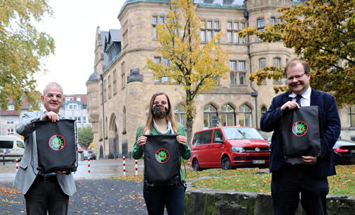Bild: Volker Hülsmann (v.l.n.r.), Fachbereichsleiter Kinder, Jugend und Familie, Mitarbeiterin Angelique Arns und der Beigeordnete Dr. Sebastian Sanders stellten die Info-Bags vor.
