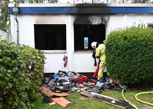 Dorsten. Auf dem Gelände einer Caritas-Flüchtlingsunterkunft an der Crawleystraße brannte gegen 6.45 Uhr die Kleiderkammer. Mehrere Trupps unter Atemschutz drangen in das ebenerdige Gebäude ein und löschten die Flammen. Ein Raum brannte komplett aus. Andere Teile wurden durch den Brand stark in Mitleidenschaft gezogen. Daher mussten auch Teile der Deckenkonstruktion geöffnet werden, um auch letzte Glutnester mit der Wärmebildkamera zu lokalisieren und unter Hinzugabe von Löschschaum abzulöschen.