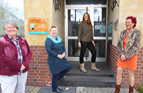 Im Foto vor der Frauenberatungsstelle von rechts: Andrea Wilhelm, Lore Messarosch, Silke Niewohner und Manuela Sabozin-Oberem.