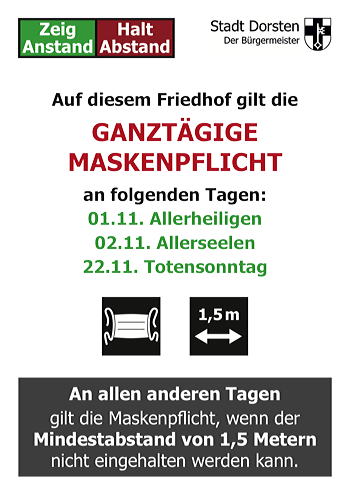 Die Stadt Dorsten geht einen Schritt weiter und spricht von einer „Ganztägigen Maskenpflicht“ an Allerheiligen, Allerseelen und Totensonntag. Allerdings gilt auch hier die Beschränkung nur, wenn der Mindestabstand nicht eingehalten werden kann.
