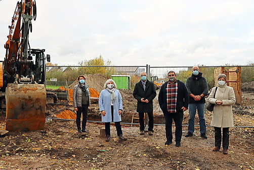 Bild: Bürgermeister Matthias Müller und Stadtbaurätin Janine Feldmann machten sich gemeinsam mit Vertretern des Zentralen Betriebshofs Herten sowie Mitgliedern des Integrationsrates vor Ort ein Bild von den laufenden Bauarbeiten.