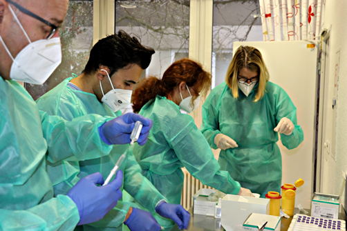 Bis die Impfung im größten Seniorenzentrum des Kreises Recklinghausen losgehen konnte, war noch einiges vorzubereiten. Allem voran der Impfstoff. Dieser kam schon in den frühen Morgenstunden in kleinen Ampullen als Konzentrat, das dann kurz vor dem Impfen aufbereitet werden muss. Das ist auch für die vier Ärzte Dr. Ulrike Bürgel-Elbers, Dr. Serkan Sereflioglu, Dr. Angelika und Dr. Markus Böddeker, die die Bewohner der Einrichtung auch sonst betreuen, eine neue Herausforderung. Normalerweise kommt Impfstoff als fertiges Präparat. Nach einem ersten gemeinsamen Antasten, streng nach der mitgelieferten Anweisungen, bereiten die Mediziner mehrere Spritzen vor.