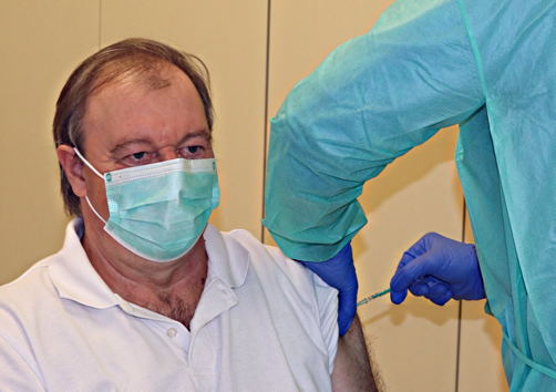 Auf einem Tablett gelegen wandern die fertigen Dosen langsam und vorsichtig in das Impfzimmer. Dort warten bereits die beiden Impflinge. Jürgen Popp ist der erste (Bild). Während die Mitarbeiter applaudieren, krempelt der Rentner sein T-Shirt hoch. Dr. Sereflioglu desinfiziert die Haut am Oberarm, setzt die Nadel an – und nach wenigen Sekunden sind die 0,3 Milliliter Impfstoff in den Muskel injiziert. Auf die Frage, ob es ihm gut gehe, erwidert Popp ein gut gelauntes „Ja sicher!“.