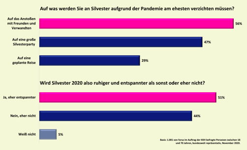 Wie eine entsprechende forsa-Umfrage im Auftrag der KKH Kaufmännische Krankenkasse zeigt, befürchteten bereits im November 56 Prozent der Befragten, an Silvester wegen Corona auf das gemeinsame Anstoßen mit Verwandten und Freunden verzichten zu müssen. Knapp die Hälfte sah darüber hinaus keine Chance für eine große Silvesterparty und 29 Prozent ahnten bereits, dass sie auf eine zum Jahreswechsel geplante Reise verzichten müssen. Jeder Zweite glaubte deshalb auch, dass Silvester in diesem Jahr weniger turbulent und etwas entspannter sein wird als sonst. Knapp die andere Hälfte (44 Prozent) vermutete allerdings genau das Gegenteil, denn anstelle von Planungs- und Partystress dürfte nun – ähnlich wie an Weihnachten – die Angst vor dem Virus und der damit verbundenen Einschränkungen im Fokus stehen.