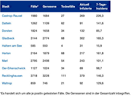 Vest. Ein Inzidenzwert von 15,9 – aus heutiger Sicht ein Traumwert. Und den weist die Stadt Haltern am See auf, geradezu vorbildlich. Am Ende der Städteskala im Kreis steht Castrop-Rauxel mit 226,3.