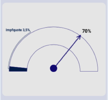 Die Grafik zeigt die Impfquote im Kreis Recklinghausen (Erstimpfung bezogen auf die Gesamtbevölkerung). Nach heutigem Stand sollen 70 v.H. der Bevölkerung eine Immunität entwickelt haben, um die Pandemie einzudämmen. Aktuell sind aber nur 3,5 v.H. (kleiner Balken links unten) geimpft worden.
