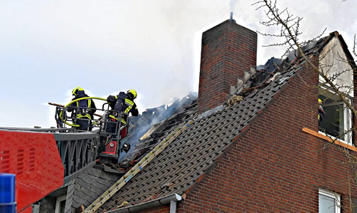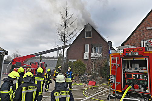Vor Eintreffen der ersten Einsatzkräfte hatten die Bewohner das Gebäude bereits verlassen können und blieben unverletzt. Allerdings hatte der Brand auf den Dachstuhl des Wohnhauses übergegriffen. Flammen und eine starke Rauchwicklung waren deutlich sichtbar.