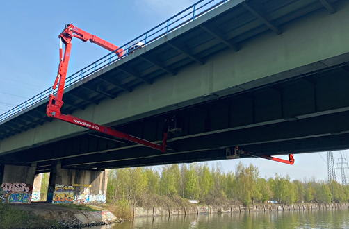 Bild: Die Arbeiten finden mithilfe eines Kranwagens statt, der auf der Brücke steht und wahlweise einen Steg oder einen Korb unter das Bauwerk herablässt.