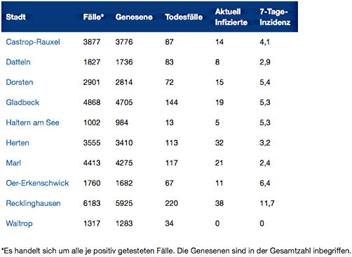 Vest. Es gibt vier weitere Todesfälle im Zusammenhang mit dem Corona-Virus im Kreis Recklinghausen. Verstorben sind ein 90-jähriger Mann aus Castrop-Rauxel, eine 61-jährige Frau aus Gladbeck, eine 85-jährige Frau aus Marl und ein 65-jähriger Mann aus Recklinghausen. Da die 7-Tage-Inzidenz aktuell stabil unter dem Wert von 35 liegt, gelten im Kreis Recklinghausen die Regelungen der Coronaschutzverordnung Inzidenz-Stufe 1.