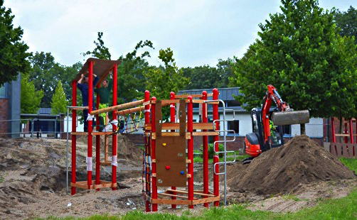 Bild: Mitarbeiter des Zentralen Betriebshof bauen derzeit neue Spielgeräte auf dem Schulhof der Grundschule Sickingmühle auf. Foto: Stadt Marl