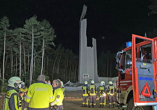 Bild: Feuerwehr und Polizei vor dem Trümmerfeld des abgeknickten Windrads in Haltern am See. Fotos: Bludau
