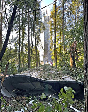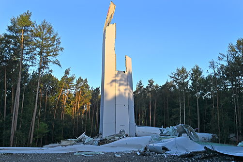 Das Windrad ist aus bislang unbekannten Gründen auf einer Höhe von etwa zwanzig Metern abgeknickt. Tonnenschwere Elemente krachten in den umgebenden Wald.