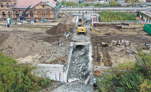Dorsten. Die Schienen sind längst weg, deshalb ist der Fußgängertunnel auch überflüssig und wird wieder abgerissen. Am alten Dorstener Bahnhof ist viel los. Früher konnte man ihn nur zwischen zwei Schienensträngen erreichen. Deshalb wurde zur Erleichterung vom Stadtkern aus der Tunnel gebaut. Doch die Zeiten änderten sich. Das Bahnhofsgebäude wurde völlig überflüssig und vergammelte. Der westliche Schienenstrang ist abgebaut und inzwischen hat die große Umgestaltung begonnen. Das Gebäude bekommt eine Komplett-Sanierung und neue Aufgaben (unter anderem Gastronomie), das Gelände wird renaturiert. Übrig bleibt die bereits überarbeitete Bahn-Haltestelle auf der östlichen Seite. Foto: Bludau