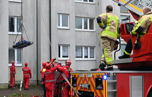 Die Rettung ging nur per Drehleiter von außen durchs Fenster. Mithilfe eines Rettungskorbes, der an den ausgefahrenen Leiterpark gehängt wurde, kam der Patient aus dem Obergeschoss des Mehrfamilienhauses zu Boden. Einsatzleiter Michael Dolega von der Feuerwehr Marl berichtete, dass solche Einsätze mittlerweile Routine für die speziell geschulte Gruppe sind.