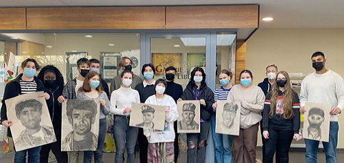 Bild: Schülerinnen und Schüler aus dem Beruflichen Gymnasium Kunst/Englisch präsentieren ihre Arbeiten zum Thema „Kohlegesichter“ vor der „Schülergalerie Libelle“ im Foyer der Schule.