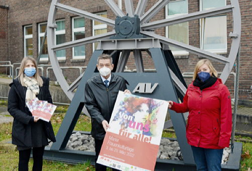 Bild: Sie freuen sich auf das vielfältige Programm der Frauenkulturtage 2022: Bürgermeister Werner Arndt, städtische Gleichstellungsbeauftragte Kim-Karina Bönte (l.) und Vorsitzende des Ausschusses für Geschlechtergerechtigkeit, Vielfalt und Toleranz Maresa Kallmeier (r.). Foto: Stadt Marl