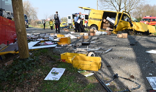 Bild: In Rhade krachten ein Linienbus der DB und ein Pakettransporter der Deutschen Post zusammen. Einer von zwei Unfällen kurz hintereinander. Foto: Bludau