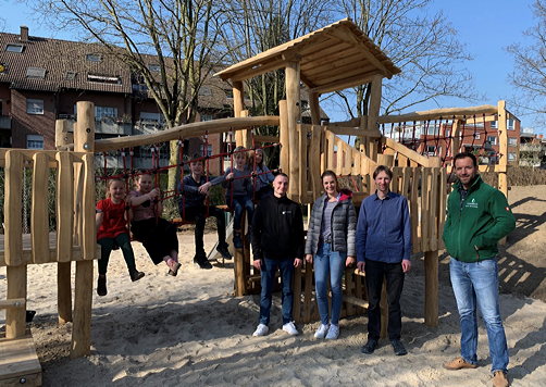 Bild: Die Kinderbürgermeister Matilda Clodt und Ben Buttler sowie weitere Kinder, die den Spielplatz nach der Eröffnung sofort erobert haben, mit Tim Skowronek (Abteilung Jugendförderung), Eden Fähnrich (Abteilungsleitung Jugendförderung), Stefan Pesenacker (Tiefbauamt/Grünflächenabteilung) und Jonas Gerschinsky von der Firma Garten- und Landschaftsbau Eckard Vornbrock. Quelle: Stadt Dorsten
